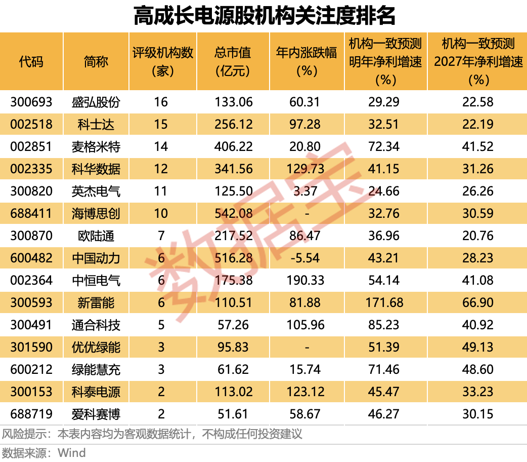 从未来成长性来看,根据机构一致预测,有15只个股2026年、2027年净利增速均超20%。其中,麦格米特、科华数据、海博思创、中恒电气、通合科技等机构一致预测明后两年净利增速均超30%。