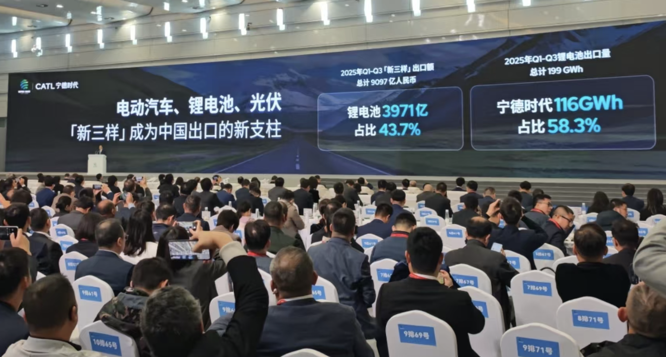 曾毓群指出:“今年前三季度,‘新三样’出口总额超过9000亿元,其中锂电池贡献近4000亿元,占比超过四成。在近200GWh的锂电池出口总量中,宁德时代出口120GWh,占比近六成。”
