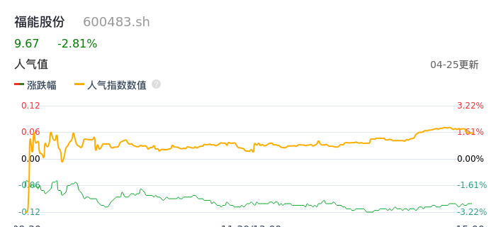 04月25日,福能股份收报9.67,股价涨幅-2.81%,成交金额1.83亿元,换手率0.73%。