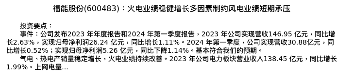 值得注意的是:2024年04月上海申银万国证券研究所的王璐/朱赫分析师,首次发布关于福能股份的研究报告,标题为:福能股份(600483):火电业绩稳健增长多因素制约风电业绩短期承压。
