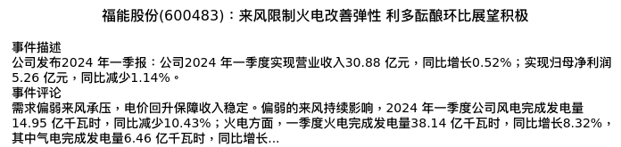 值得注意的是:2024年04月长江证券的张韦华/司旗/宋尚骞/刘亚辉分析师,首次发布关于福能股份的研究报告,标题为:福能股份(600483):来风限制火电改善弹性 利多酝酿环比展望积极。