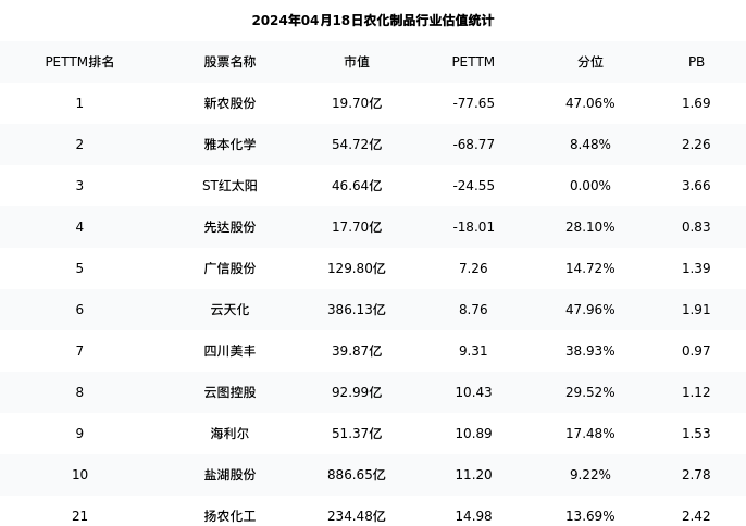 从估值角度看:扬农化工最新市盈率PETTM为14.98,在行业内排名17/57,处于13.69分位。