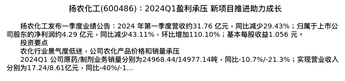 值得注意的是:2024年04月华鑫证券的张伟保分析师,首次发布关于扬农化工的研究报告,标题为:扬农化工(600486):2024Q1盈利承压 新项目推进助力成长。