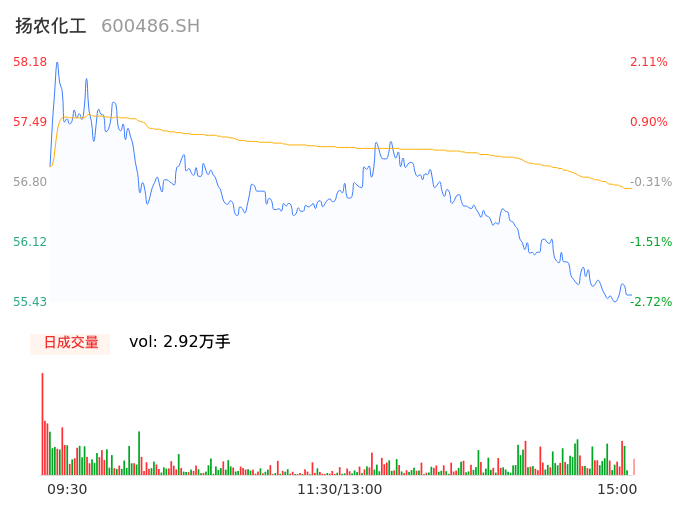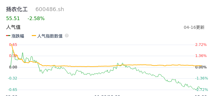 04月16日,扬农化工收报55.51,股价涨幅-2.58%,成交金额1.66亿元,换手率0.73%。