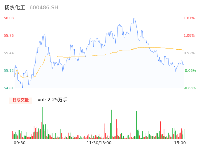 04月12日,扬农化工收报55.20,股价涨幅0.07%,成交金额1.25亿元,换手率0.56%。