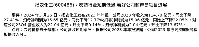 值得注意的是:2024年04月长城证券的肖亚平分析师,首次发布关于扬农化工的研究报告,标题为:扬农化工(600486):农药行业短期低迷 看好公司葫芦岛项目进展。