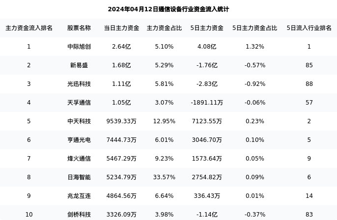 下表为今日行业内流入前10股票的信息