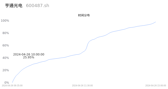 600487亨通光电2024年04月26日成交125.56万手,成交金额17.08亿元,相较昨日放量64.78万手,换手率5.09%,成交清淡。