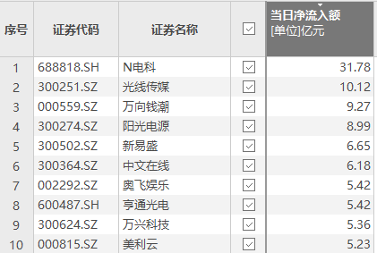 上证报中国证券网讯Choice数据显示,2月10日,资金净流入额排名前十的个股依次是N电科、光线传媒、万向钱潮、阳光电源、新易盛、中文在线、奥飞娱乐、亨通光电、万兴科技、美利云。其中,N电科上市首日股价大涨596%,同时获资金净流入31.78亿元。