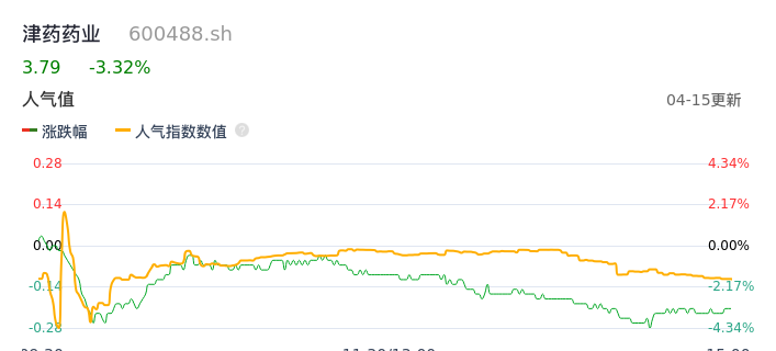 04月15日,津药药业收报3.79,股价涨幅-3.32%,成交金额3868.65万元,换手率0.92%。