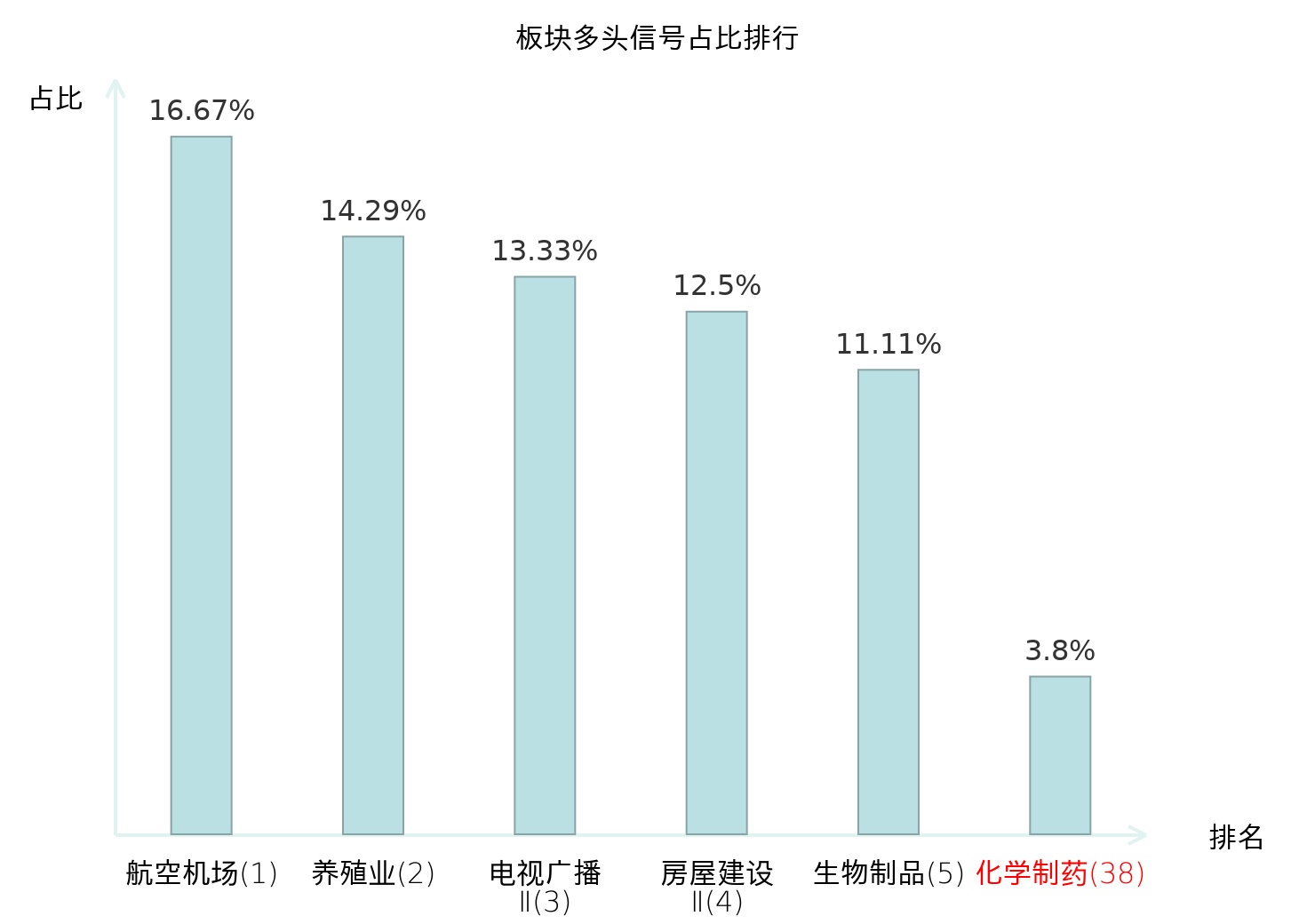全市场所有行业板块中主力多头信号占比排名中,航空机场板块位居第一。航空机场板块名次提升最快,较昨日上升113位。