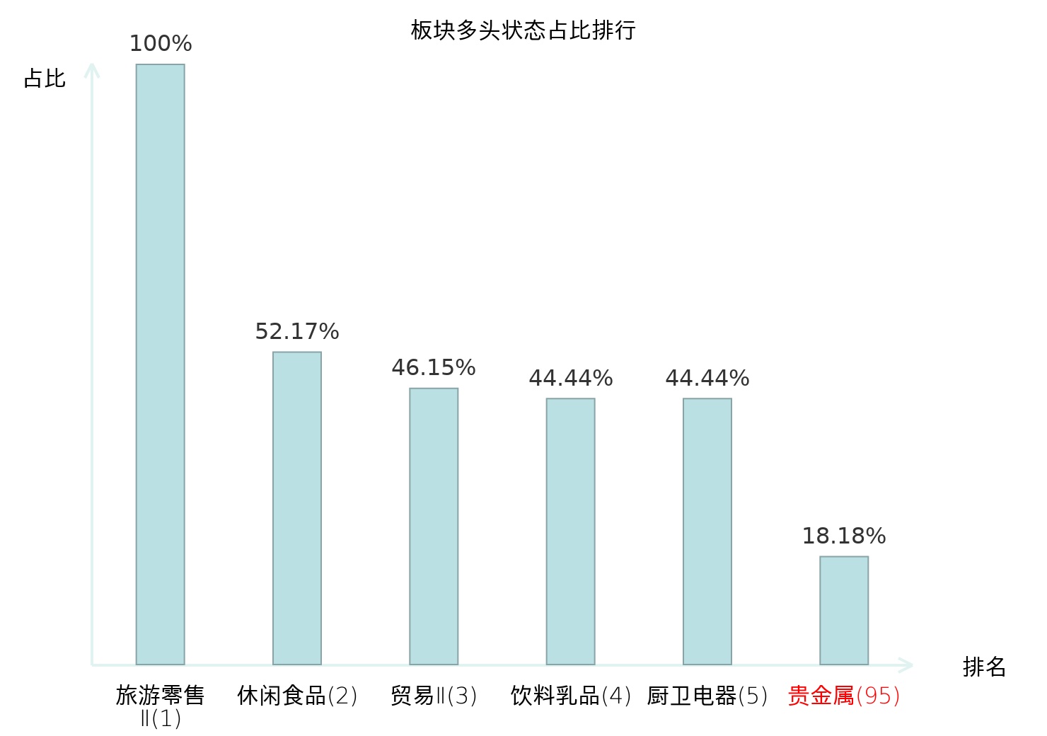 全市场所有行业板块中主力多头状态占比排名中,旅游零售Ⅱ板块位居第一。乘用车板块名次提升最快,较昨日上升91位。