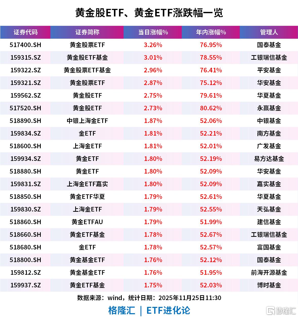 截至午盘黄金股票ETF、黄金股ETF基金涨超3%;黄金股票ETF基金、黄金股票ETF、黄金股ETF涨超2.7%;中银上海金ETF、金ETF、上海金ETF、黄金ETF、上海金ETF嘉实、黄金ETF华夏、黄金ETFAU、黄金ETF基金、黄金基金ETF、黄金ETF基金涨超1.7%。