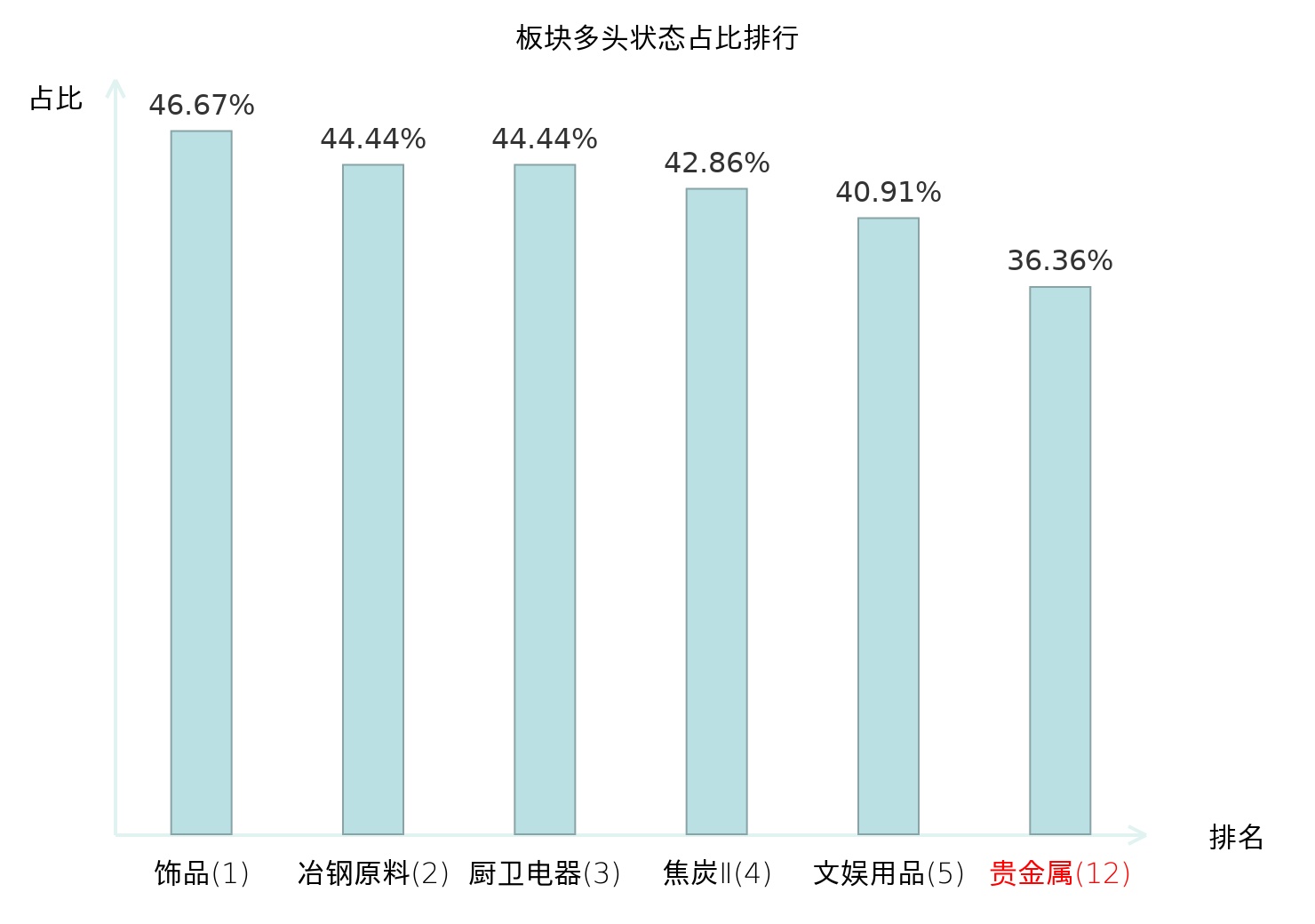 全市场所有行业板块中主力多头状态占比排名中,饰品板块位居第一。专业连锁Ⅱ板块名次提升最快,较昨日上升68位。