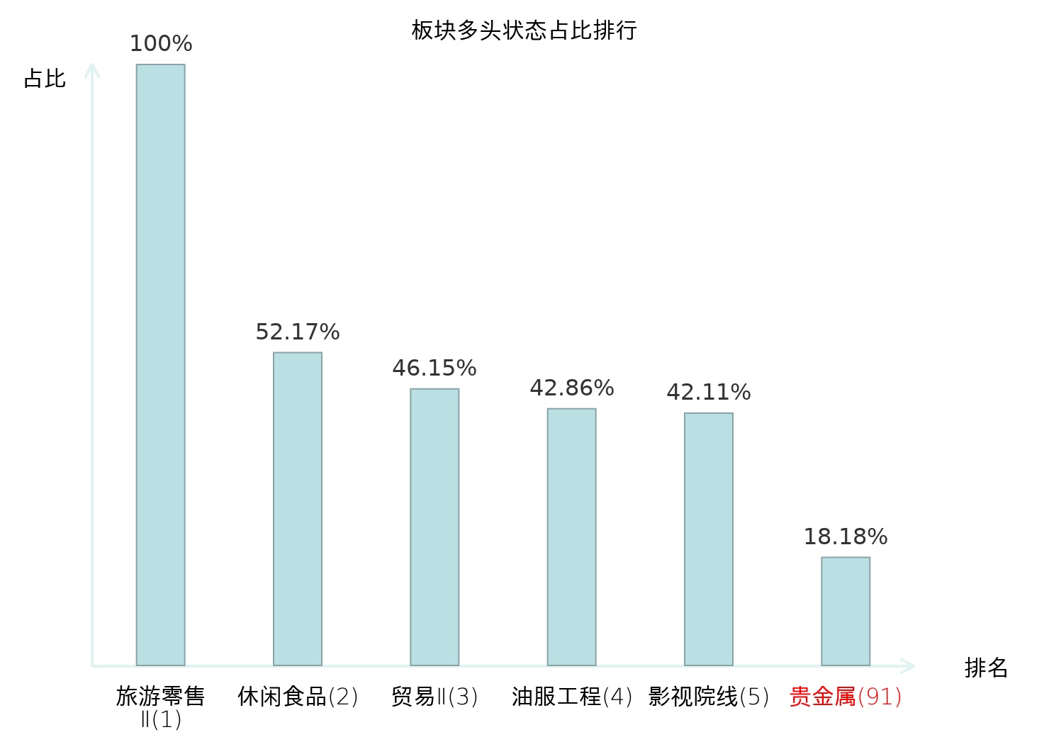 全市场所有行业板块中主力多头状态占比排名中,旅游零售Ⅱ板块位居第一。体育Ⅱ板块名次提升最快,较昨日上升99位。