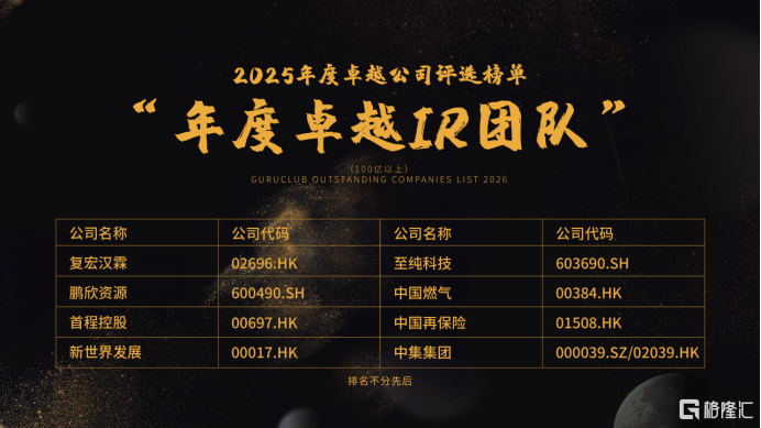 12月22日,格隆汇在线上举办"科技赋能·资本破局"分享会。本次分享会,备受瞩目的卓越公司评选榜单将隆重揭晓,其中格隆汇“金格奖”年度卓越公司评选中,复宏汉霖(02696.HK)、鹏欣资源(600490.SH)、首程控股(00697.HK)、新世界发展(00017.HK)、至纯科技 (603690.SH)、中国燃气(00384.HK)、中国再保险(01508.HK)、中集集团(000039.SZ/02039.HK) 8家企业荣获“年度卓越IR团队(大市值)”奖项。(排名不分先后,按公司首部字母顺序排列)