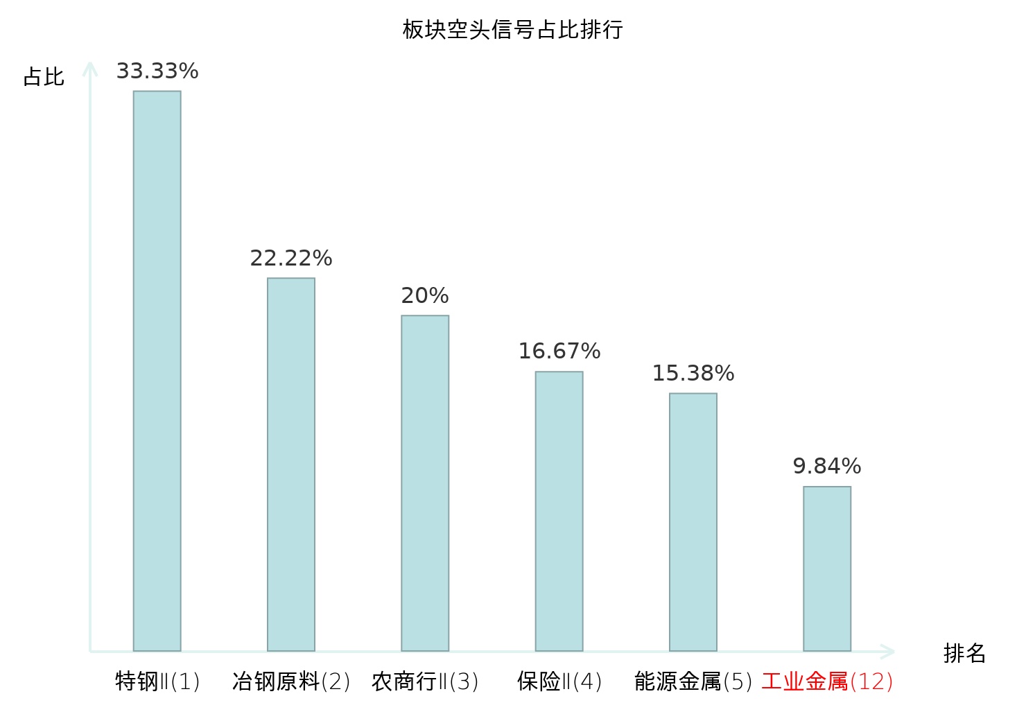 全市场所有行业板块中主力空头信号占比排名中,特钢Ⅱ板块位居第一。其他电子Ⅱ板块名次提升最快,较昨日上升117位。