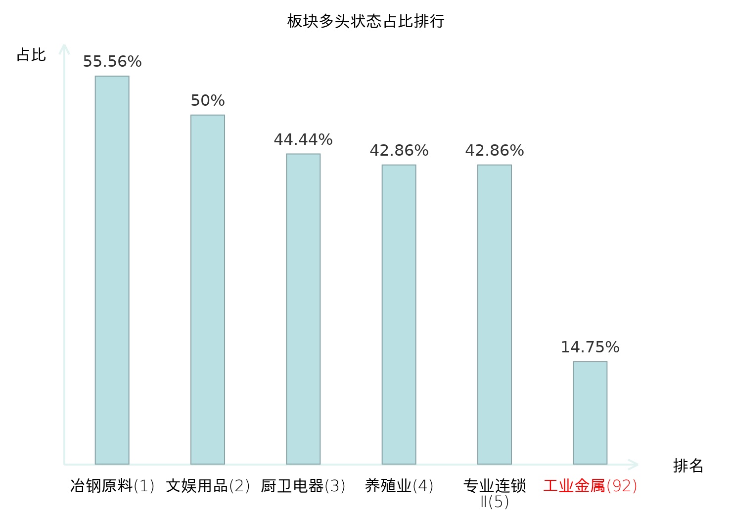 全市场所有行业板块中主力多头状态占比排名中,冶钢原料板块位居第一。能源金属板块名次提升最快,较昨日上升48位。