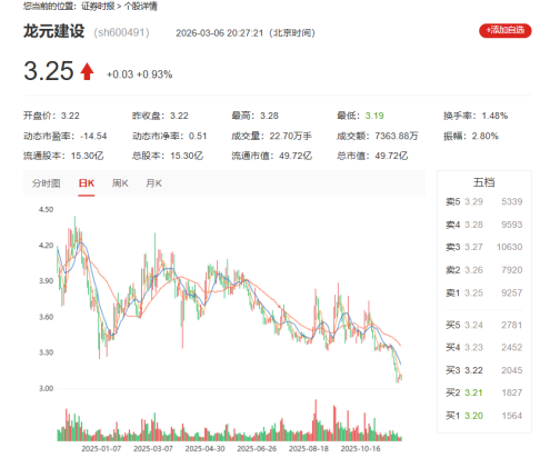 尽管公司作出风险可控的表态,但从股票市场走势来看,龙元建设的表现却不容乐观。最近一年多以来,公司股价总体呈持续下行态势,截至2026年3月6日收盘,股价报3.25元/股。
