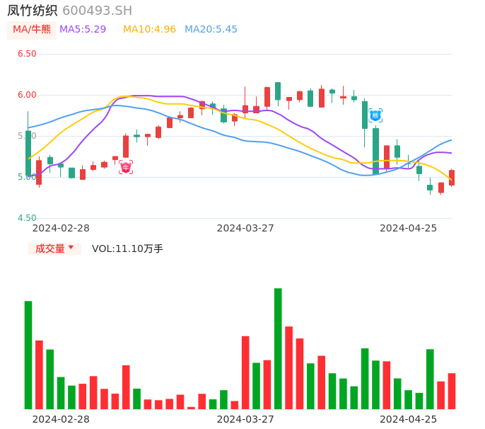 04月25日,凤竹纺织收报5.08,股价涨幅3.04%,成交金额5566.19万元,换手率4.08%。
