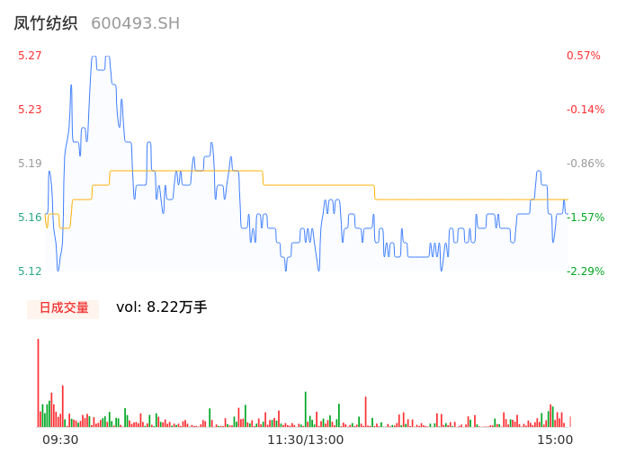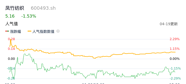 04月19日,凤竹纺织收报5.16,股价涨幅-1.53%,成交金额4249.50万元,换手率3.02%。