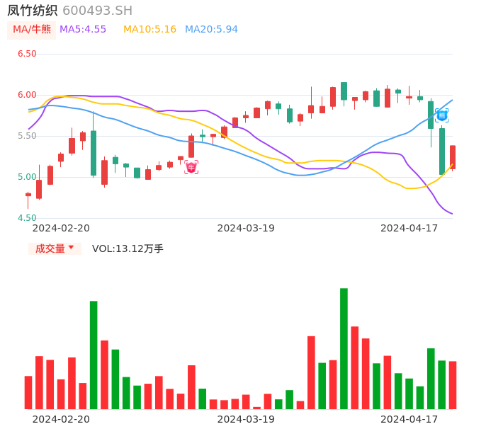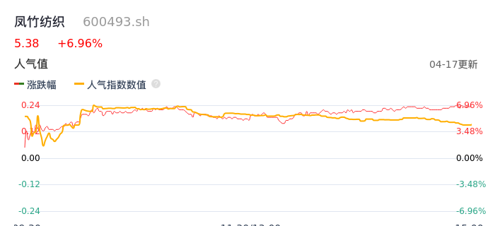 04月17日,凤竹纺织收报5.38,股价涨幅6.96%,成交金额6938.25万元,换手率4.83%。