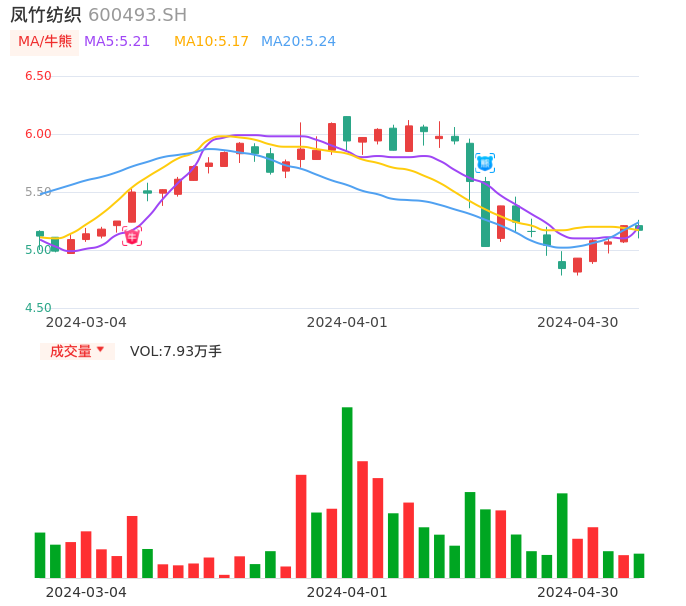04月30日,凤竹纺织收报5.17,股价涨幅-0.77%,成交金额4098.87万元,换手率2.91%。