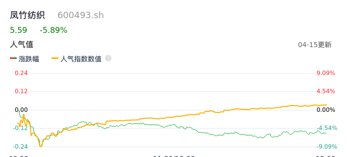 04月15日,凤竹纺织收报5.59,股价涨幅-5.89%,成交金额8654.52万元,换手率5.63%。