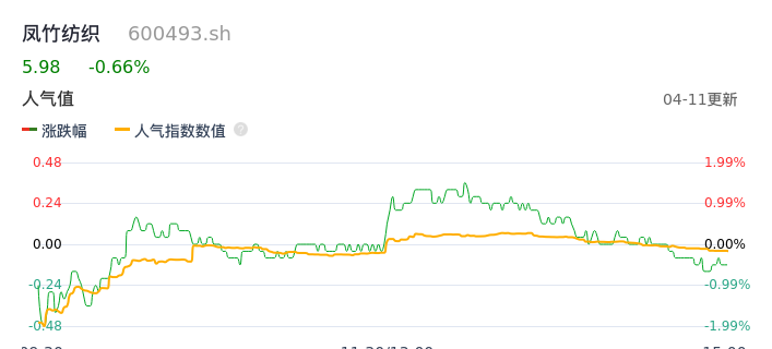 04月11日,凤竹纺织收报5.98,股价涨幅-0.66%,成交金额6144.93万元,换手率3.75%。