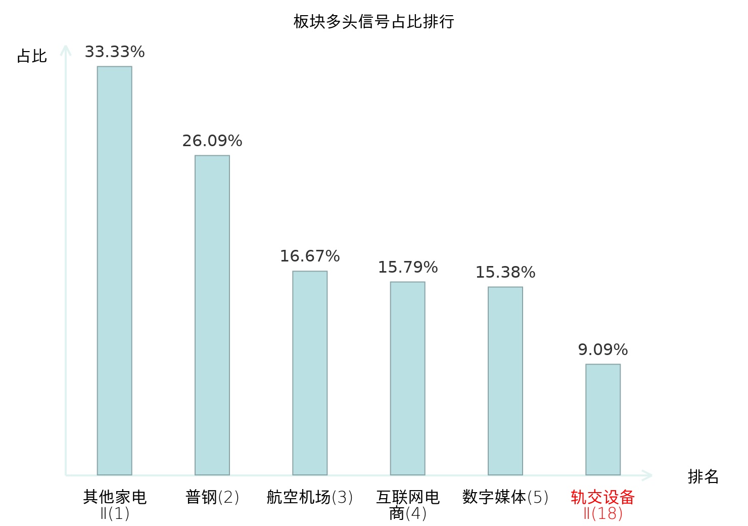全市场所有行业板块中主力多头信号占比排名中,其他家电Ⅱ板块位居第一。其他家电Ⅱ板块名次提升最快,较昨日上升129位。