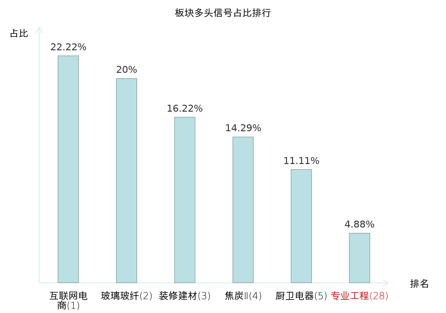 全市场所有行业板块中主力多头信号占比排名中,互联网电商板块位居第一。焦炭Ⅱ板块名次提升最快,较昨日上升118位。