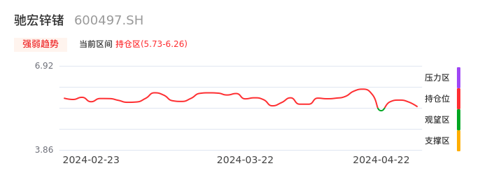 我们来看一下该股的九方特色指标强弱趋势的情况:驰宏锌锗自04月17日从观望区上穿到持仓区。股价近期在多头区域回调整理。后续重点关注多空分界点的争夺:5.73元。如未能有效站稳则可能重新回到空头行情。