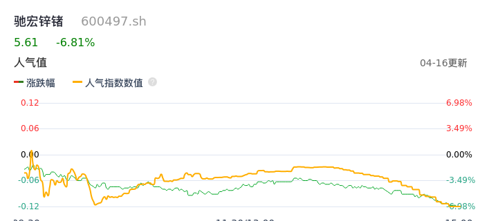 04月16日,驰宏锌锗收报5.61,股价涨幅-6.81%,成交金额14.14亿元,换手率4.82%。