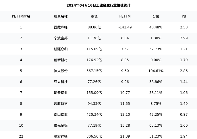 从估值角度看:驰宏锌锗最新市盈率PETTM为21.39,在行业内排名21/59,处于31.23分位。