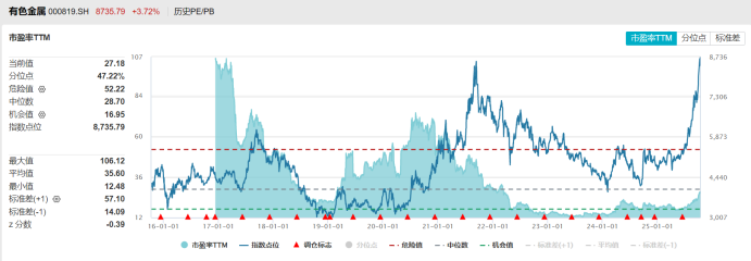 注:中证申万有色金属指数目前市盈率及分位点情况(截至10月13日收盘)