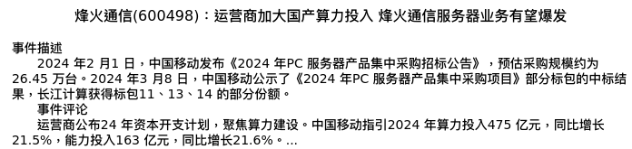 值得注意的是:2024年04月长江证券的分析师,首次发布关于烽火通信的研究报告,标题为:烽火通信(600498):运营商加大国产算力投入 烽火通信服务器业务有望爆发。