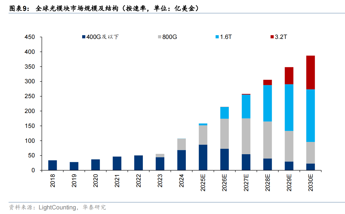 根据Light Counting的预测,在全球云厂商加码AI资本开支背景下,预计2026年市场规模有望突破200亿美金,其中800G光模块为核心品类,且1.6T亦有望贡献新增量。