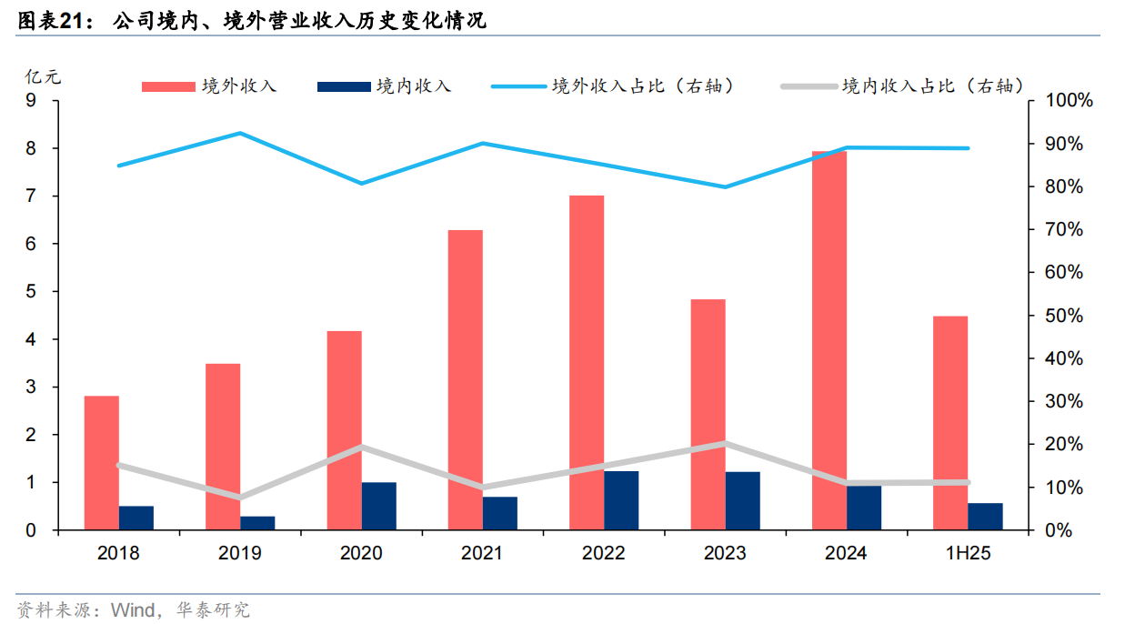 公司产品以海外销售为主,产品主要销往美国、欧洲等国家和地区,近年来公司产品出口销售收入占同期营业收入的比例始终保持较高水平。2023年公司境外收入占比为80%2024年该比例提升至89%1H25该比例保持89%高位。随着公司继续推进在海外数通市场的开拓,我们预计公司境外市场收入占比仍将保持较高位。