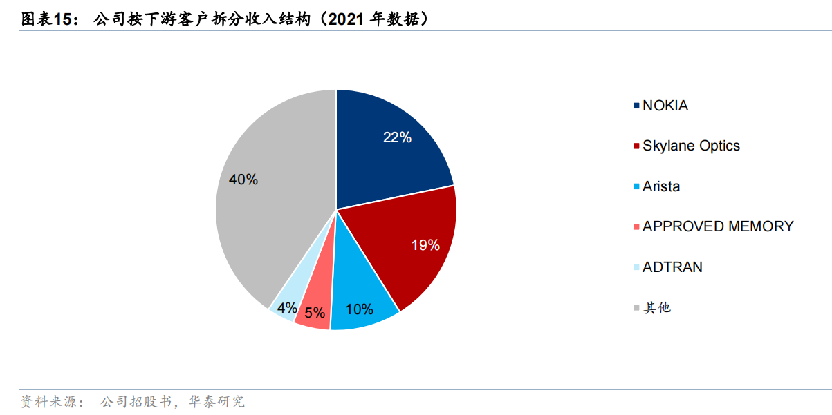 目前公司作为国内少数具备100G~800G高速率光器件研发设计和批量化生产能力的厂商,产品的质量一致性和稳定性得到NOKIAAristaADTRANHaloGoogle FiberCienaInfinera中兴通讯、新华三、烽火通信锐捷网络、浪潮等国内外一流客户认可根据公司招股书,公司2021年前五大客户中包括NOKIAArista等海外头部设备厂商。