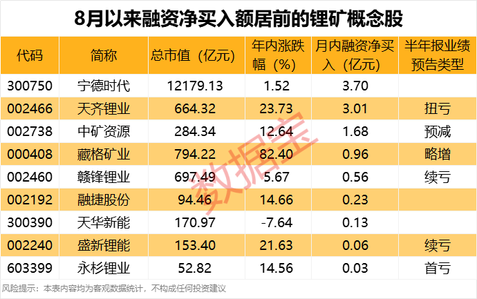 8月以来,10余只锂矿概念股获得融资资金加仓,宁德时代天齐锂业中矿资源分别获得3.7亿元、3.01亿元和1.68亿元净买入。