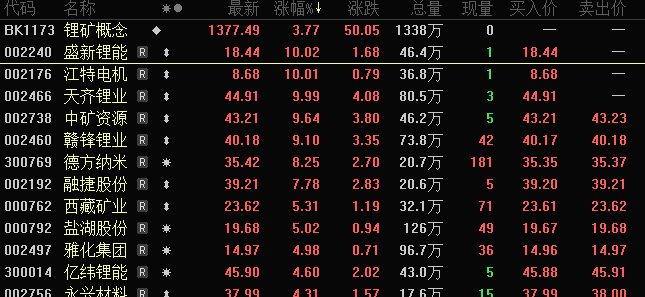 锂矿股今日开盘大涨,截至午间收盘,盛新锂能天齐锂业江特电机涨停,中矿资源赣锋锂业大涨超9%。