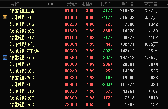 受此影响,早盘碳酸锂期货所有合约均触及涨停,其中主力合约一字涨停,涨幅8%,报81000元/吨。