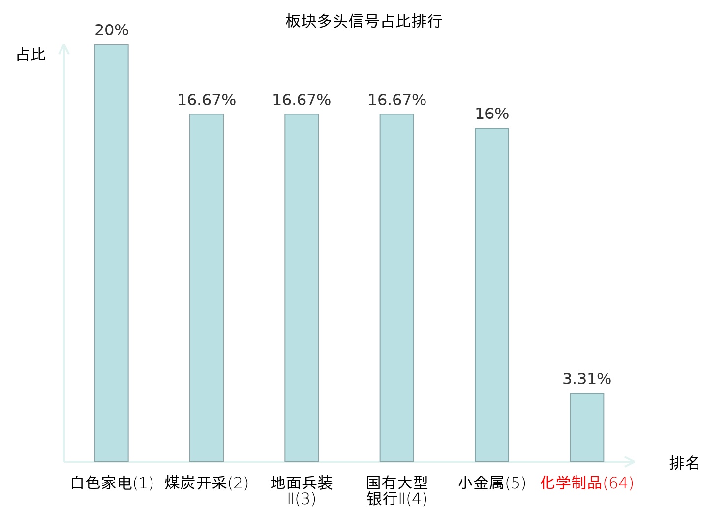 全市场所有行业板块中主力多头信号占比排名中,白色家电板块位居第一。国有大型银行Ⅱ板块名次提升最快,较昨日上升119位。