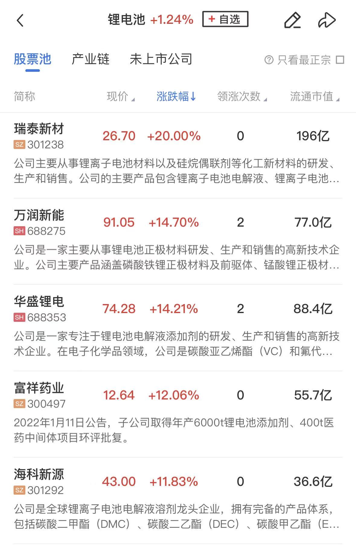锂电概念股再度走强,其中氟化工、电解液方向领涨,天际股份、石大胜华、中欣氟材、多氟多、氯碱化工涨停。