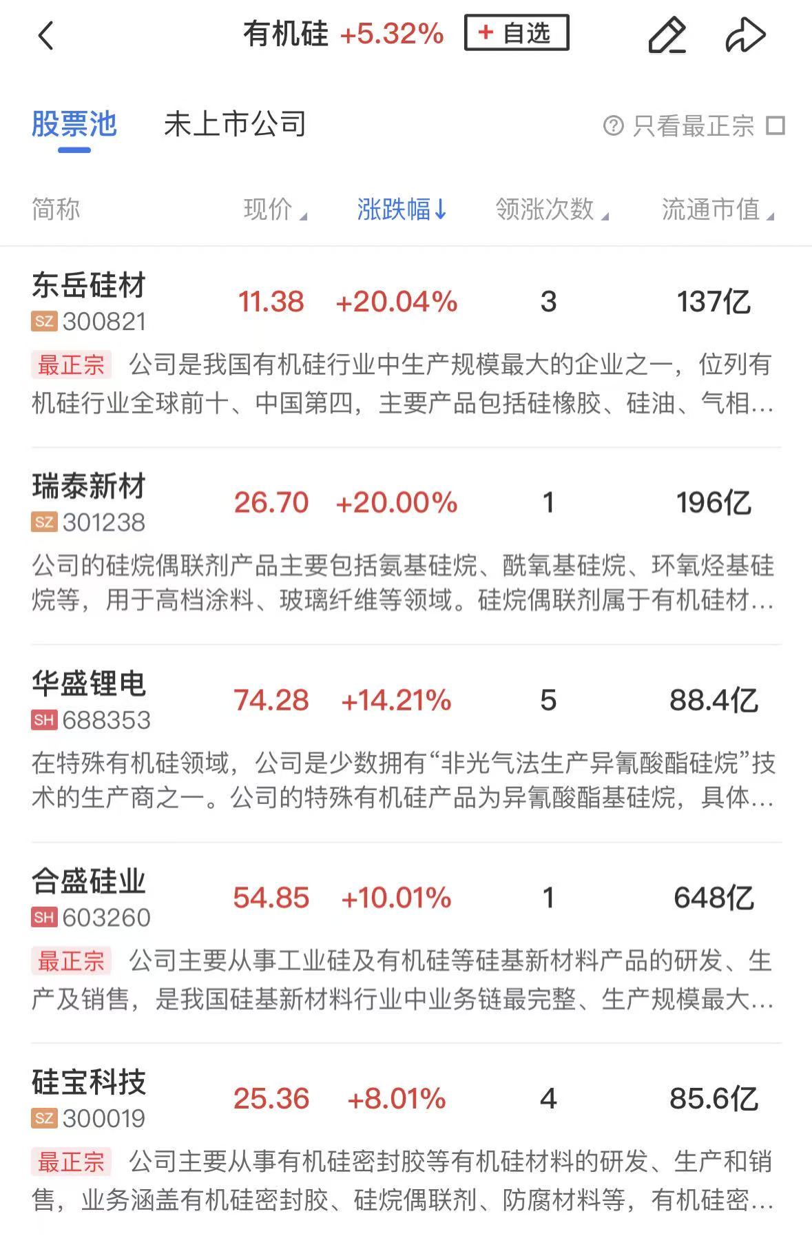 板块上,有机硅涨幅居前,东岳硅材、瑞泰新材、江苏国泰、合盛硅业涨停,硅宝科技、新安股份涨幅居前。此外光伏板块同样表现活跃,弘元绿能、蓝丰生化、亿晶光电涨停,通威股份、大全能源涨幅居前。