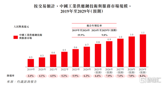 灼识咨询预测,到2029年,中国工业供应链数字化渗透率有望提升至8.2%,并带动工业供应链技术与服务市场规模从2024年的人民币0.7万亿元快速增长至人民币1.1万亿元,年复合增长率接近9.8%。