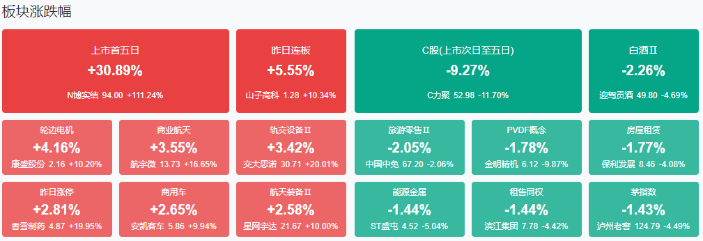 盘面上,轨交、高铁概念股再度大涨,交大思诺、威奥股份、神州高铁、晋亿实业等涨停。商业航天概念股维持强势,春晖智控、航天晨光、航天长峰、星网宇达等涨停。芯片股午后冲高,士兰微、中晶科技均一度涨停。低空经济概念股尾盘拉升,上工申贝、宗申动力、王子新材涨停。网约车概念股继续活跃,通达电气、海马汽车、江西长运涨停。下跌方面,白酒股陷入调整,迎驾贡酒跌近5%。板块方面,轨交设备、网约车、商业航天、半导体等板块涨幅居前,白酒、家电、零售、煤炭等板块跌幅居前。
