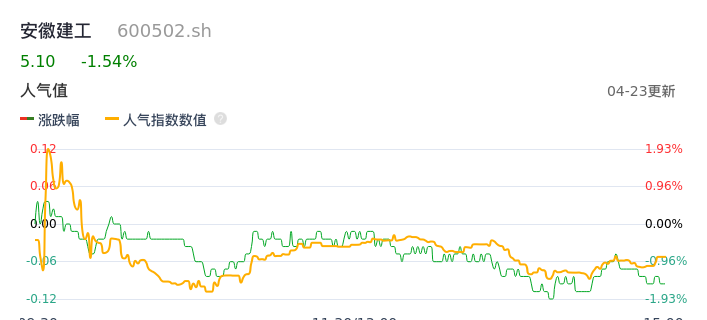 04月23日,安徽建工收报5.10,股价涨幅-1.54%,成交金额2.22亿元,换手率2.51%。