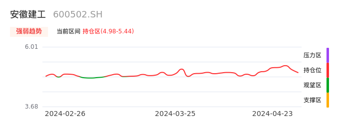 我们来看一下该股的九方特色指标强弱趋势的情况:安徽建工自03月11日从观望区上穿到持仓区。股价近期在多头区域回调整理。后续重点关注多空分界点的争夺:4.98元。如未能有效站稳则可能重新回到空头行情。