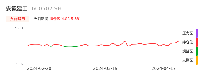 我们来看一下该股的九方特色指标强弱趋势的情况:安徽建工自03月11日从观望区上穿到持仓区。股价近期在多头区域持续强势上扬,上升动能仍较为充足,可积极关注。后续重点关注上方压力位:5.33元是否能突破上攻。